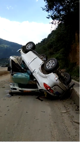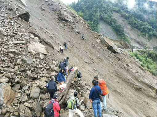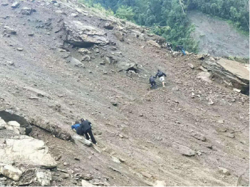 情況最危險(xiǎn)的要屬2018年9月10日下午1點(diǎn)半、從德欽縣返回貢山縣的途中,在翻越碧羅雪山、剛從山頂往下走了不遠(yuǎn)的地方突然塌方,阻斷了唯一的下山道路。隨后嘗試返回,因連綿的陰雨天氣,上山途中一段土路濕滑無(wú)法重新返回山頂,因此被困于海拔約3000米的山腰上。
