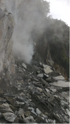 到了第二天午飯后,牧民家的可用食品已全部被消滅;下午4點(diǎn),連綿的細(xì)雨暫停了一會(huì),塌方點(diǎn)山體看上去也相對(duì)穩(wěn)定,不再有大石頭落下,所以及時(shí)不能確保完全安全,我們也必須翻過(guò)塌方點(diǎn),因?yàn)橐呀?jīng)沒(méi)有食物了,而且隨時(shí)可能再次下雨,那時(shí)就是想過(guò)也不能過(guò)。